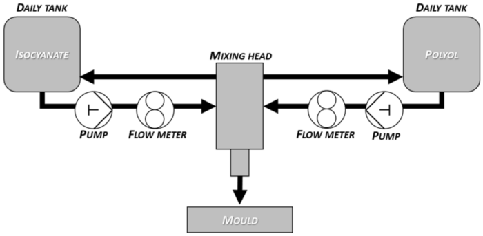 Pour fabriquer une mousse PU rigide, on mélange les deux composants liquides principaux à un agent gonflant, ainsi qu’à divers additifs (catalyseurs, agents ignifuges, stabilisants). Le mélange est chauffé et soumis à une réaction chimique rapide qui libère de la chaleur. Celle-ci provoque l’évaporation du gaz de gonflement, ce qui entraîne la formation de bulles. Ces bulles se développent jusqu’à former une structure alvéolaire qui se solidifie en mousse rigide.